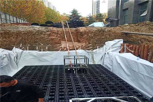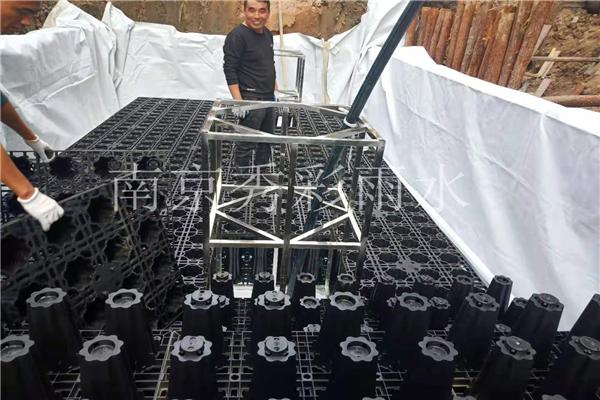 模塊的連接過(guò)程中,要盡量避免垂直連接,上下層之間應(yīng)該交叉式連接。先鋪設(shè)第1層,然后再逐層往上鋪設(shè)。在雨水供水裝置和雨水排泥裝置處安裝雨水模塊加固框架。若集水井中有水就必須保證一直抽水。