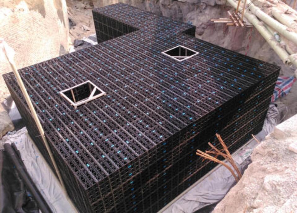 2、雨水儲水池:采用PP模塊組合水池,每塊單體尺寸為540*540*520,豎向承壓450kn/m2層間采用連接件進行連接。儲水池外面包裹一層復合防滲膜,水池頂部鋪設一層400-500g/m2的土工布,整個水池外側還需要包裹高強度塑料網格,側面還需采用厚度約為40mm厚的擠塑板進行回填防護。